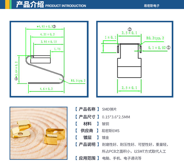 EMS易密斯,2009年創(chuàng)立于昆山,主要產(chǎn)品為EMI鈹銅簧片、不銹鋼彈片、導電泡棉和其他配套電子材料,是目前華東最具規(guī)模、產(chǎn)品最齊全的民用電子設備EMI電磁干擾屏蔽材料解決方案提供商。
