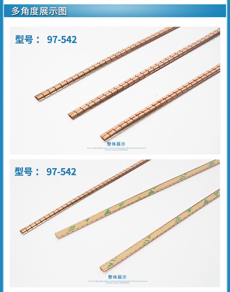 易密斯™鈹銅簧片由具有電磁兼容屏蔽效果的進口鈹銅合金C17200制成,具有優(yōu)秀的抗壓性、回彈性和耐腐蝕性,并提供很好的寬頻電磁屏蔽效果,特別適用于通訊機柜、電腦、屏蔽室/門、面板及插拔件的間隙填充。易密斯™鈹銅簧片現(xiàn)有60余款標(biāo)準(zhǔn)件可供選擇,同時可支持定制。