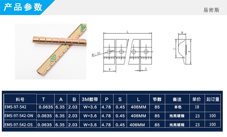 EMS易密斯,2009年創(chuàng)立于昆山,主要產(chǎn)品為EMI鈹銅簧片、不銹鋼彈片、導(dǎo)電泡棉和其他配套電子材料,是目前華東最具規(guī)模、產(chǎn)品最齊全的民用電子設(shè)備EMI電磁干擾屏蔽材料解決方案提供商。