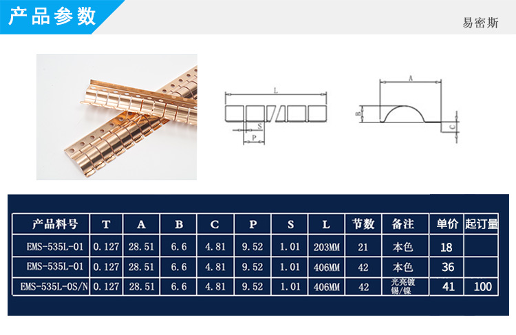 易密斯™鈹銅簧片由具有電磁兼容屏蔽效果的進(jìn)口鈹銅合金C17200制成,具有優(yōu)秀的抗壓性、回彈性和耐腐蝕性,并提供很好的寬頻電磁屏蔽效果,特別適用于通訊機(jī)柜、電腦、屏蔽室/門、面板及插拔件的間隙填充。易密斯™鈹銅簧片現(xiàn)有60余款標(biāo)準(zhǔn)件可供選擇,同時(shí)可支持定制。