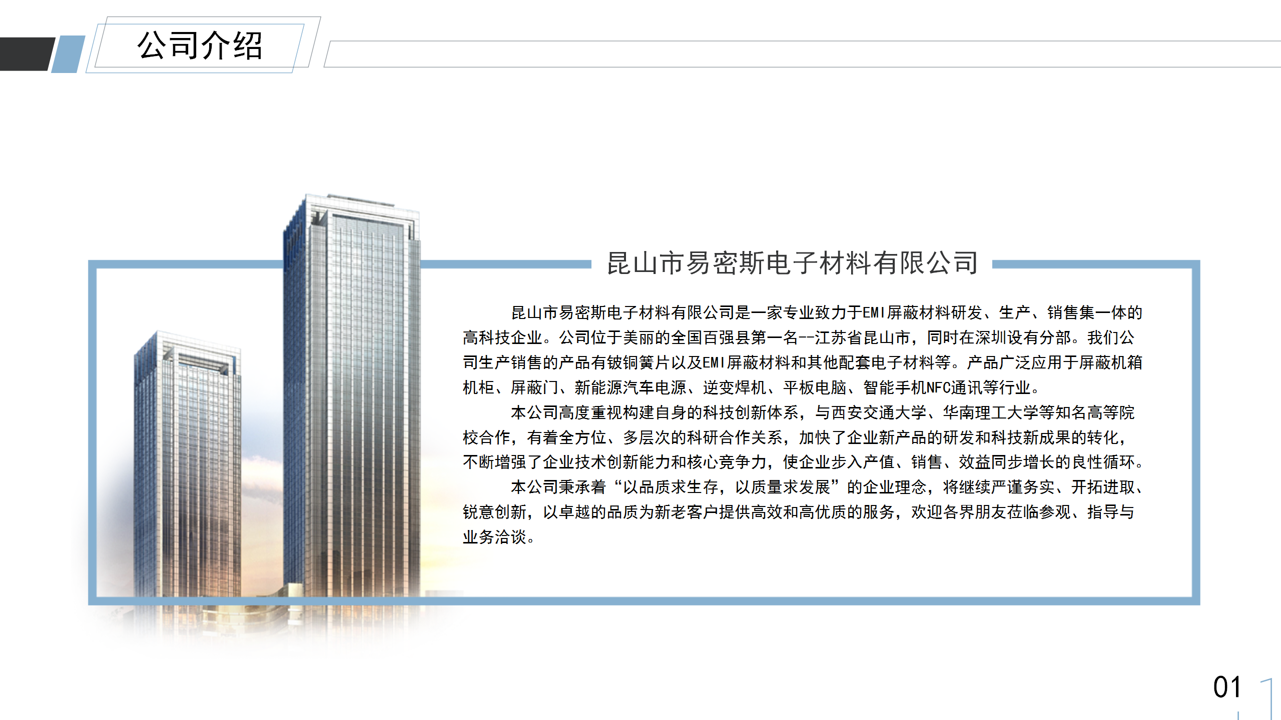 EMS易密斯,2009年創(chuàng)立于江蘇昆山,主要產(chǎn)品為EMI屏蔽材料(例如:鈹銅簧片、鈹銅彈片、屏蔽彈片、SMD彈片、屏蔽門專用簧片、人防門專用簧